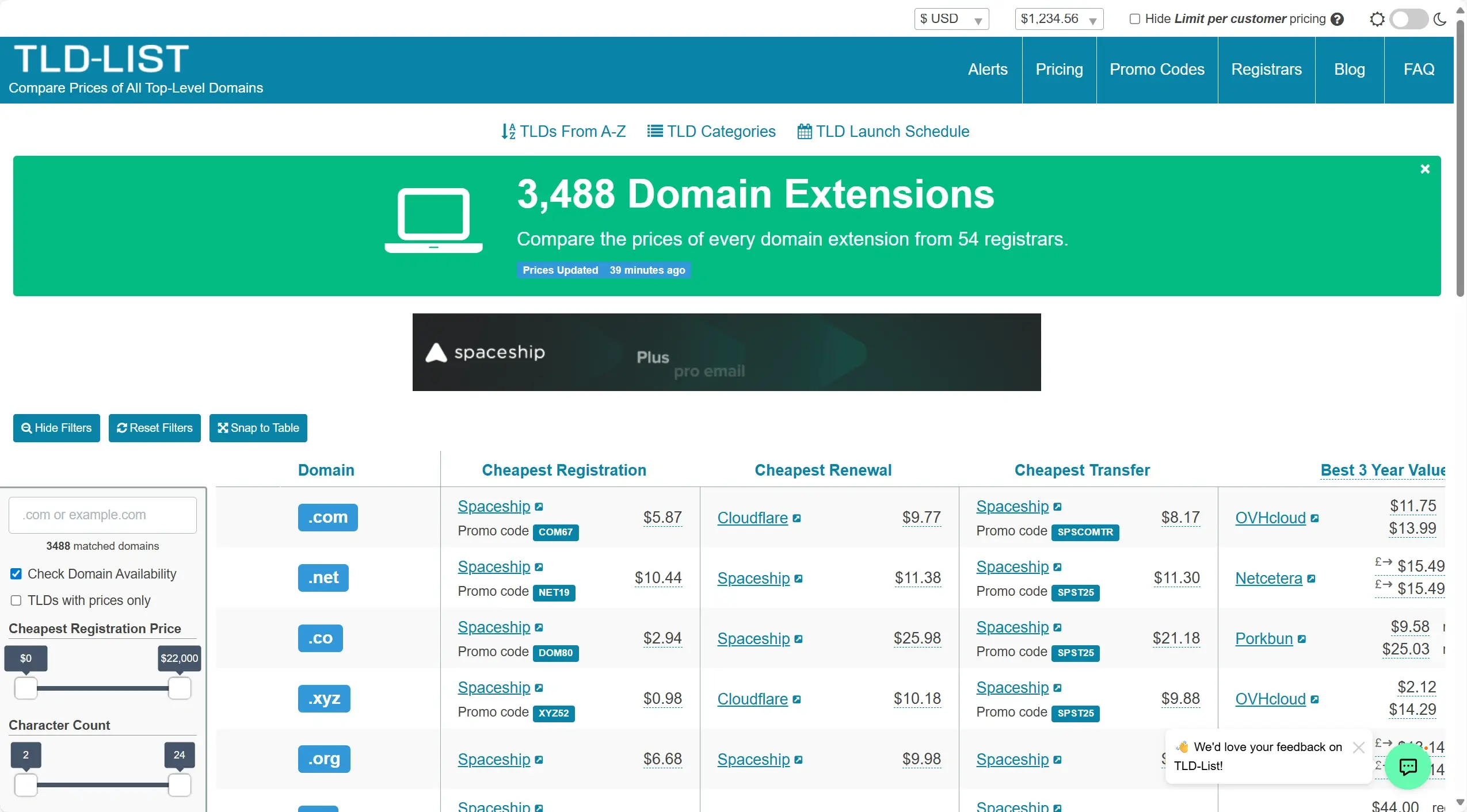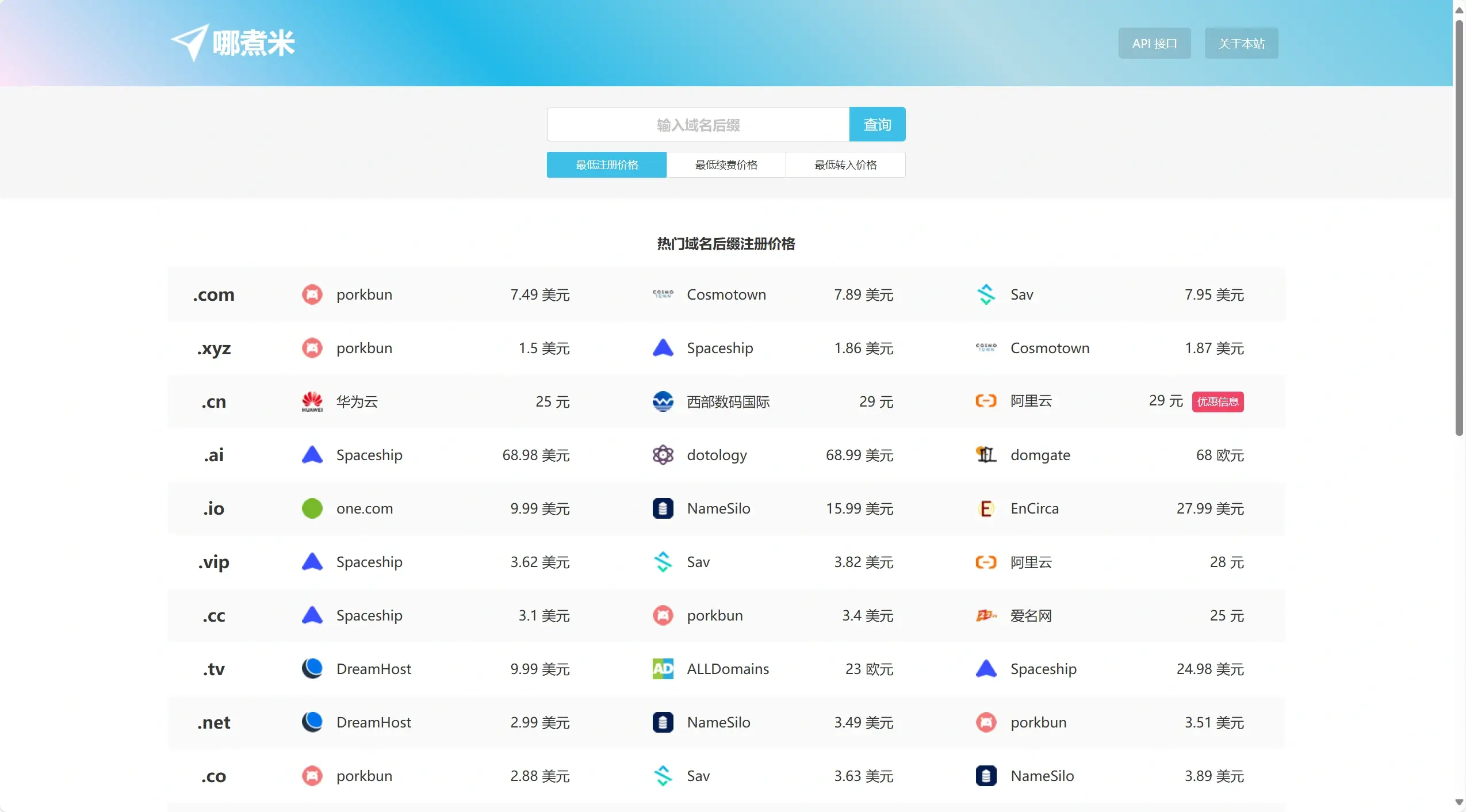 所以我们可以通过对比每个域名注册商的价格找到最低价,然而手动查看每个注册商的价格未免太过费劲。我这里推荐两个网站非常好用,它们是 TLD-List 和哪煮米,页面都比较直观,可以轻松的看出在同一域名注册商购买不同域名价格差距以及在不同域名注册商购买相同域名的价格差距。
